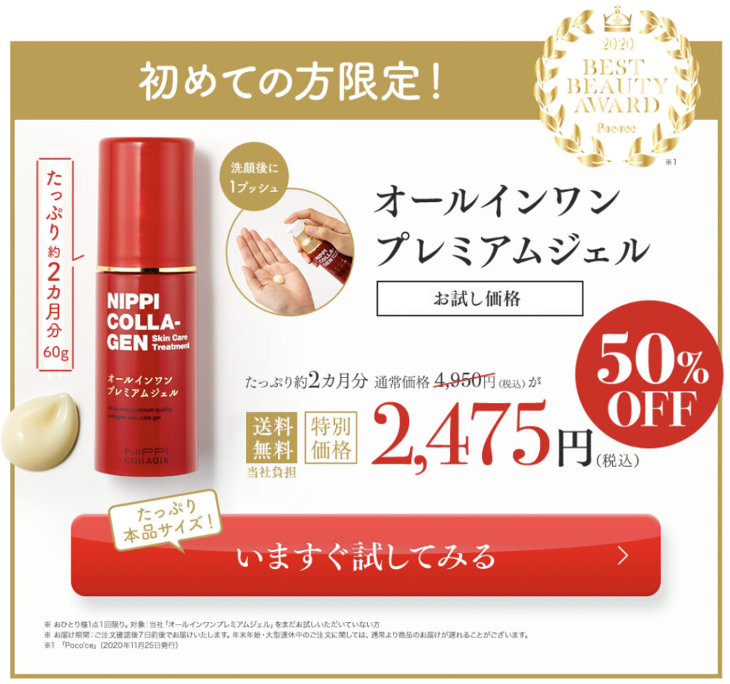 お風呂上がりの肌につけると、コラーゲンを肌がごくごく飲んでる感じ!肌のハリのケアはコレ一個で完結です。キャンペーン特典でたっぷり2ヶ月試せて 2,475円で始められるので、正直ママ友の中でかなり流行ってます
